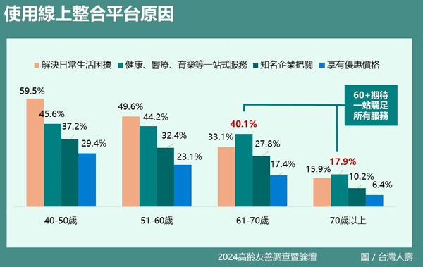 單人戶或老老同住漸成趨勢,其中高齡獨居潛在風險更值得關注,為提供高齡者更便利的生活,不只有AI機器人投入照護領域,現在跨產業預防醫學、健康管理、長照機構等康養服務更應運而生,調查發現,40歲(59.5%)至60歲(49.6%)族群的民眾,多數期待線上整合平台優先解決生活健康困擾,61歲以上(40.1%)和70+的(17.9%)高齡族群,最愛「一條龍」服務,希望有一站式快速購足健康、安養、醫療、育樂等服務,滿足高齡者與退休族全方位需求。