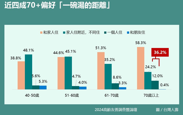 2024「高齡友善調查」從居住型態、生活風險及智慧科技層面,鎖定全臺40歲以上壯世代及高齡族群進行電話訪問,發現國人家庭態様近八成(76.2%)屬於小家庭;其中70歲以上長者將近兩成(17.8%)獨居,獨居率居各年齡層之冠;近四成(36.2%)的長輩偏好一個人住或與家人比鄰而居,和子女同住不再是老後生活最優先選項,「一碗湯的距離」兼顧親情和隱私,成為現代家庭關係的最佳溫度。