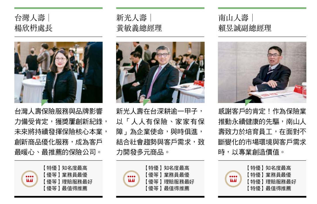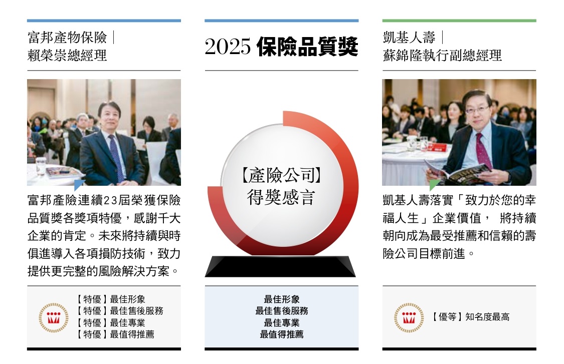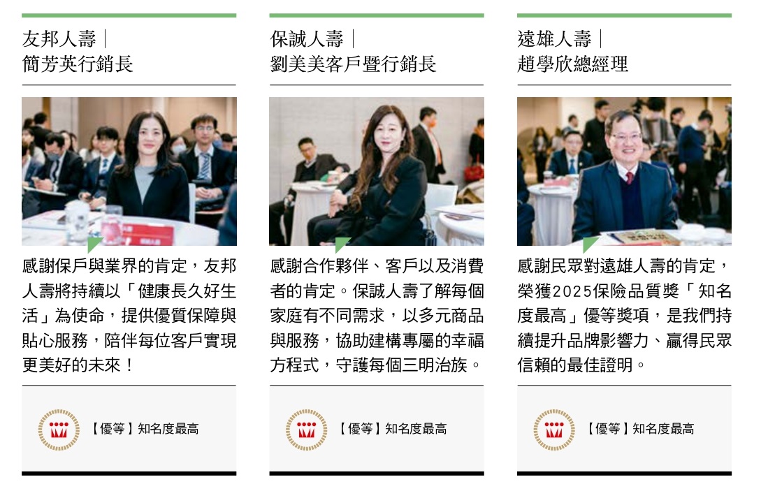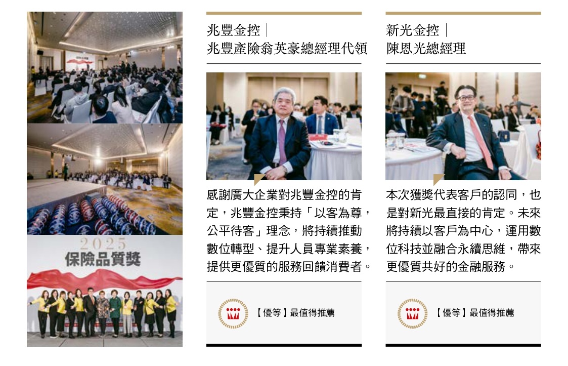 二○二五年開春之際的【保險品質獎】頒獎典禮,迎來各家保險公司的長官貴賓,得獎公司在舞台上閃耀,與會人士開心領獎、互動熱絡。