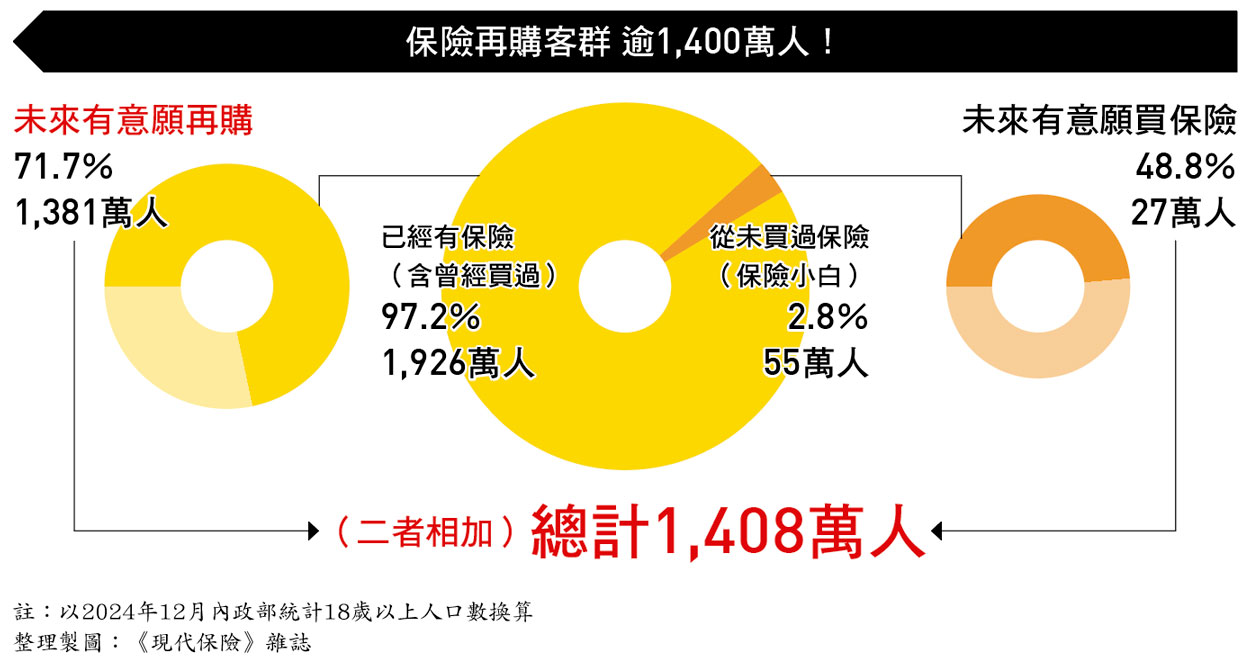 然而,進一步追問曾經或現在仍持有保險的人(97.2%),再購意願占比高達71.7%,換算人口約1,381萬人;即便是從未買過保險的人(2.8%)中,也有48.8%表達未來有購買意願,換算人口約27萬人,二者相加高達1,408萬人,由此可見保險再購商機相當龐大。