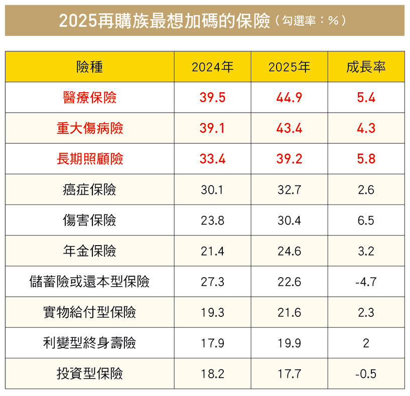 調查結果顯示,2025年再購族最想加碼的前3大險種是醫療險、重大傷病險及長照險,3險種皆較去(2024)年成長約4~5%,而成長最多是排名第5的傷害險,成長幅度達6.5%;至於保險小白未來想購買的前3名險種也包括醫療險、長照險。