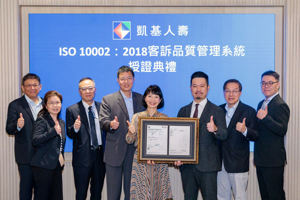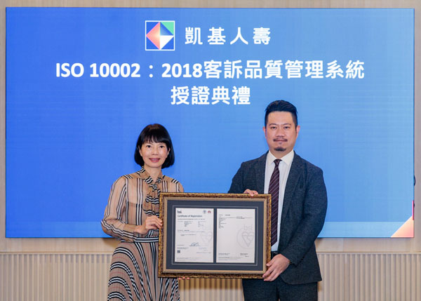 凱基人壽秉持「公平同理,待客如己」的服務理念,以超越客戶期待為目標,提供更多優質、創新及多元的保戶服務,在公司治理單位、董事會的全力支持下,上下齊心完成導入「ISO 10002:2018客訴品質管理系統」,並以「零缺失」通過國際第三方機構- BSI英國標準協會驗證,成功接軌國際。3月27日由BSI英國標準協會將證書授予凱基人壽郭瑜玲總經理,同時邀請顏信輝獨立董事見證凱基人壽以實際行動長期實踐「以客戶為中心」的價值主張。