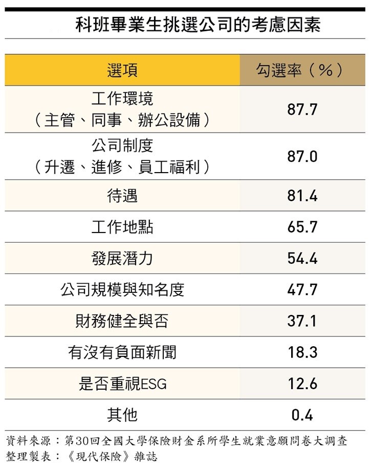 根據本刊「全國大學保險財金系所學生就業意願問卷大調查」,「工作環境」穩居冠軍,勾選率高達87.7%。換句話說,每10個受訪學生中就有將近9個認為,主管的領導風格、同事的相處氛圍,以及辦公設備等工作環境條件,是選擇公司的最重要考量。