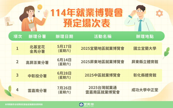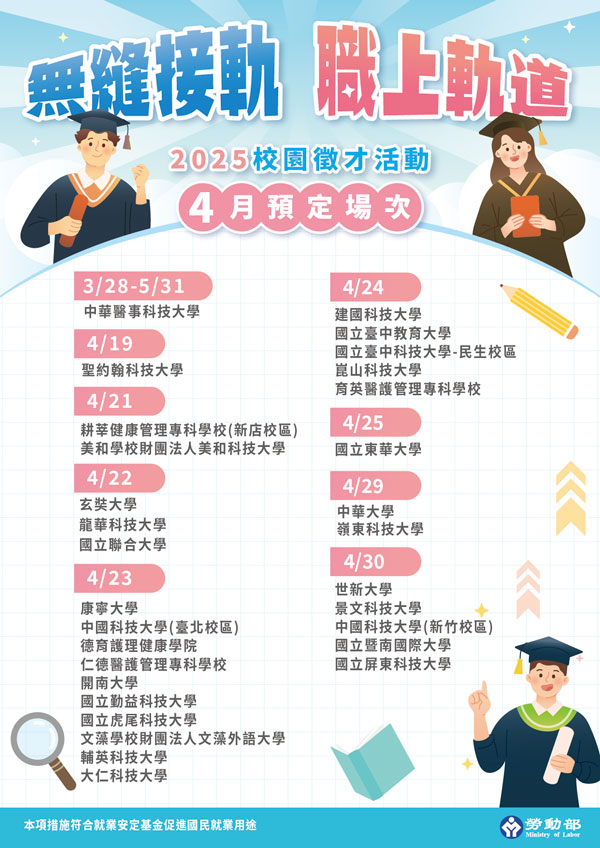 畢業季將至,為幫助青年順利從校園銜接職場,勞動部提供青年全方位支援,包括94場校園徵才活動與5場大型就業博覽會、客製化職涯發展服務等實體與網路服務,歡迎青年朋友把握機會,讓你畢業即就業!