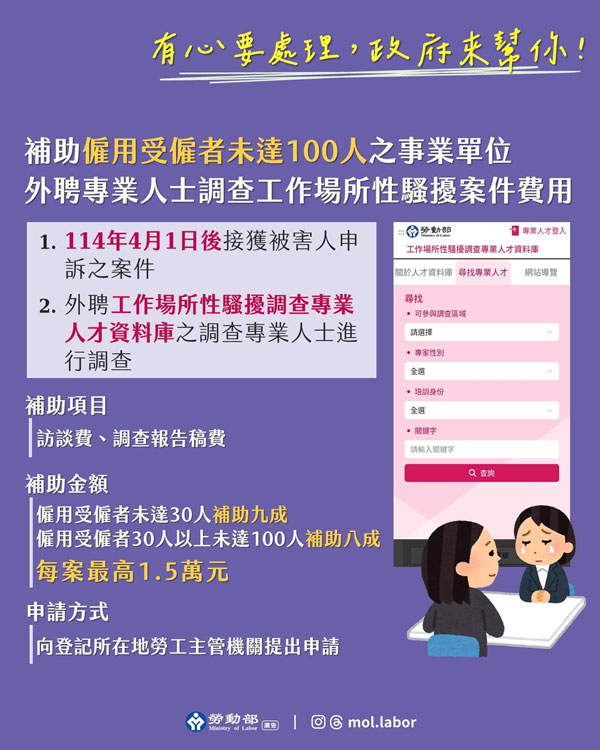 勞動部表示,本次新增的補助範圍,以114年4月1日後接獲之工作場所性騷擾申訴案件,洽請本部「工作場所性騷擾調查專業人才資料庫」的調查專業人士調查案件之訪談費及撰寫調查報告之稿費。僱用受僱者未達30人之雇主,補助所支付費用之9成;僱用受僱者30人以上未達100人之雇主,補助所支付費用之8成,每案最多補助1萬5,000元。符合申請補助條件的雇主,都可向登記所在地之勞工行政主管機關【直轄市、縣(市)政府勞工局(處)或社會局(處)】詢問及提出申請。