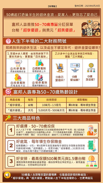 當人生走到下半場,面對即將到來的退休生活,以及處在不確定年代,退休金要從哪來?為協助熟齡族安心享退休,富邦人壽領先業界,推出50~70歲專屬的分紅金流型保單,台幣「超享優退分紅終身保險」(以下簡稱「超享優退」)與美元「超美優退外幣分紅終身保險」(以下簡稱「超美優退」),第6保單年度屆滿後每年領回生存保險金,有機會一次滿足保障增額、還本、分紅需求,協助熟齡族樂活退休,也能提前做好傳承準備。