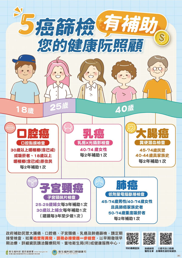 「早期發現,早期治療」是提升癌症治癒率的關鍵策略。衛生福利部持續推動多項的癌症篩檢,並自114年起擴大服務,鼓勵符合資格的民眾積極參與以下癌症的定期篩檢: