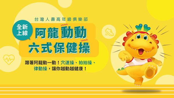 「阿龍動動六式保健操」影片於台灣人壽「高年級俱樂部」網站上線,由台灣阿龍與專業健身健練共同示範,保健操以「3S原則」,講求Simple(簡單)、Safe(安全),讓全民Sport(動起來),特別適合樂齡族、行動不便或運動初學者輕鬆上手,六式主操包含「初階穴道」強心操與保健操、「中階拍拍」排毒操與好眠操、「高階律動」健腦操與心肺操,先從暖身動作開始,主操結合伸展動作維持柔軟度、穩定性,還可活動到全身各部位基本肌肉群,每個動作簡單易做、不需要器材,民眾可自主選擇關卡挑戰,還能將成果轉發分享,與親朋好友一起運動預防失智、提升身體免疫力。