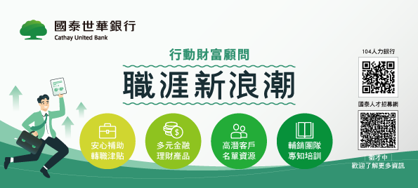 在金融服務日益多元的今天,國泰世華銀行「行動財富顧問」團隊正以創新思維與卓越服務,重新定義財富管理的樣貌。這不僅是一個充滿潛力的新興職位,更是一個讓懷抱企圖心的金融人才,能夠實現自我價值、開創職涯高峰的舞台。如果您希望在充滿挑戰與學習的環境中持續進步,並與客戶建立長期且穩固的信任關係,歡迎加入國泰世華銀行「行動財富顧問」團隊,一同探索財富管理的更多可能。