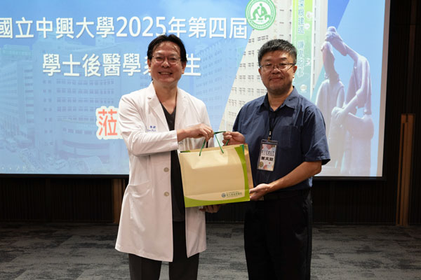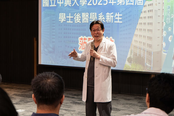 林慶雄副院長分享「深根建造、謙卑服事」的精神與自身三十餘年在彰基工作的喜悅,並以一位家屬捐贈親人大體捐贈給中興大學進行大體解剖的感人故事,提醒學生醫療不僅是技術,更是愛與感動的傳遞。