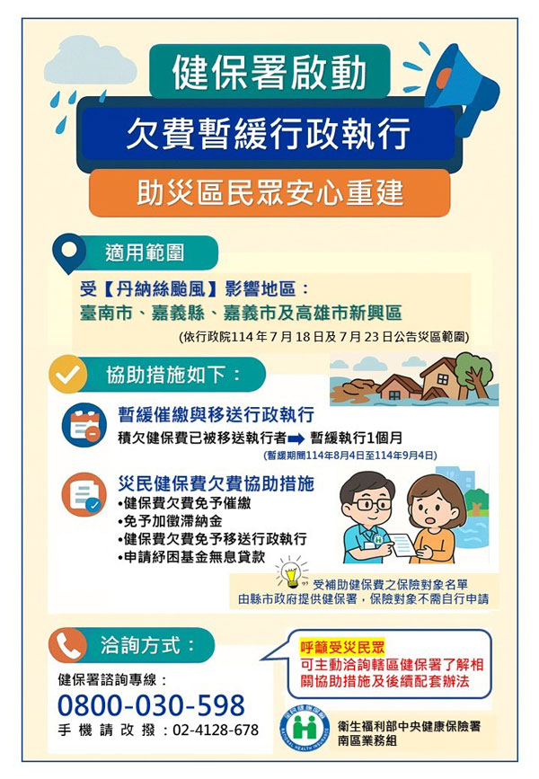受丹納絲颱風及連日豪雨影響臺南市及嘉義縣、市等地區,造成不小災情。中央健康保險署(下稱健保署)為協助災民與投保單位儘速恢復正常生活,健保署南區業務組主動向各地執行分署聲請暫緩健保費行政執行作業,以減輕經濟壓力。