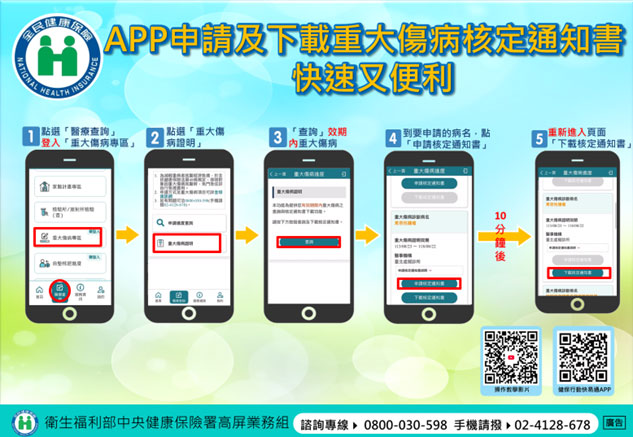 小雄(化名)被診斷罹患癌症,向中央健康保險署(下稱健保署)申請重大傷病證明,並接獲符合通知。小雄為了向其他機關申請補助及保險給付,需要多張「重大傷病核定通知書」,電話洽詢健保署高屏業務組,經人員說明後,立即透過健保快易通APP下載核定通知書,快速又方便。