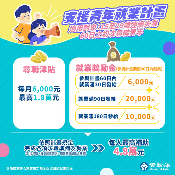 近期適逢畢業季,眾多青年初次投入職場,又因國際情勢影響,就業市場不確定性高,為加強協助畢業後尚未就業的初次尋職青年,勞動部將於114年9月1日推動「支援青年就業計畫」,相較原「初次尋職青年穩定就業計畫」的適用對象,由失業90日放寬至失業60日即可申請參加計畫,目的在於讓政府資源及早介入協助青年,避免國際經貿因素導致初入職場的尋職青年成為長期失業者;另外同時提高初次尋職青年就業意願,將尋職津貼每月5,000元,提升到6,000元,加碼最高發給4.8萬元,讓青年可安心尋職並順利就業。