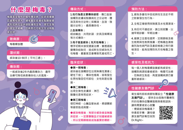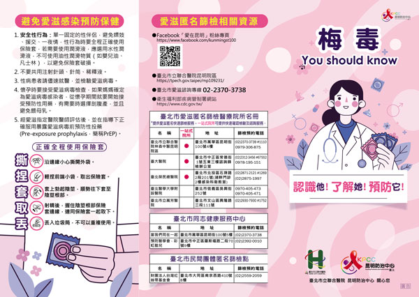 梅毒為螺旋體傳染,主要透過缺乏防護措施的性行為傳播,一旦感染若未及時治療,恐導致健康受損。但只要及早診斷並穩定接受治療,即可痊癒。為方便民眾獲取檢測服務,昆明防治中心於每週一至週五上午9時至12時、下午1時至5時,提供免費愛滋及梅毒匿名篩檢,民眾可撥打「性病與愛滋諮詢專線」(02)2370-3738預約篩檢或洽詢相關事宜,善用資源及早發現、及時治療,守護自己、伴侶與家人的健康。