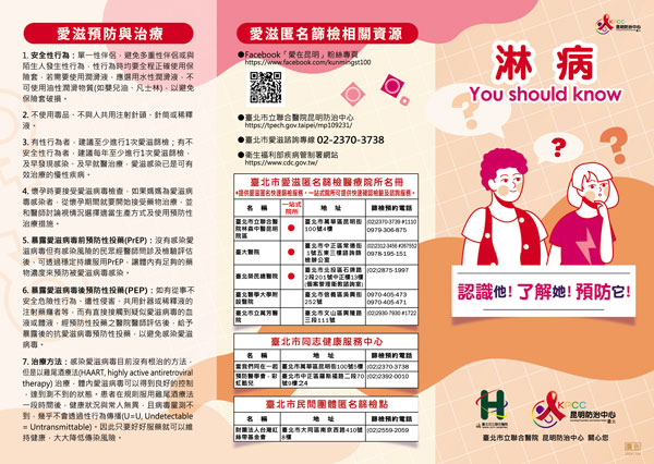 如有愛滋、性病相關疑問,或有自我篩檢、PrEP補助方案、活動資訊等服務需求,歡迎撥打臺北市「性病與愛滋諮詢專線」(02)2370-3738,預約匿名篩檢及獲得專業諮詢。同時歡迎加入Facebook「愛在昆明」粉絲專頁,隨時掌握北市最新防治資源、健康活動與政策動態。臺北市政府衛生局與臺北市立聯合醫院將持續與市民攜手,推動多元防治策略,打造健康、安全、無歧視的城市環境,讓愛滋病篩檢、預防與治療成為市民日常健康守護的重要一環。