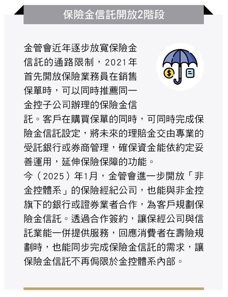 金管會也自去(二○二四)年起,開放保險經紀公司與銀行合作推廣信託,保險業務員在銷售保單的同時,也能建議客戶搭配設立保險金信託,讓保險保障不再停留在單純的理賠服務,更成為專業資產管理的延伸。