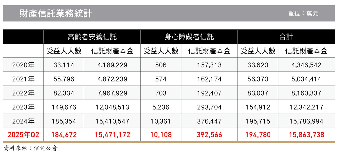 根據信託業公會資料,截至二○二四年底,信託財產本金已達一五七九億元,受益人超過十九.五萬人,與二○二○年相比,成長超過三倍規模,可見愈來愈多民眾意識到長壽風險與晚年財務安全的重要,選擇以信託作為老後的保障防護傘。