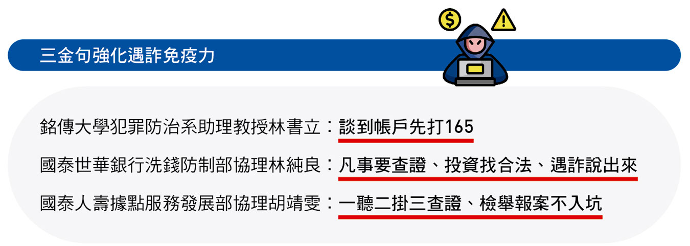 「此外,在金融機關齊力阻詐之前,更重要的是台灣的普惠金融教育必須再往下延伸。」他以三大面向說明,首先投資管道必須是政府合法授權的單位,而不是為節省少許手續費或排隊時間,上網探尋不知名的單位或到家裡收款;二是面對金融機構或警察的關切詢問,不應視為阻止夢想前進的障礙,而是幫助民眾審核把關,藉以評估風險並守護財產;三則勇敢向詐欺集團進行提告,並透過警方和律師或民間成立的反詐欺聯盟協會輔導協助。