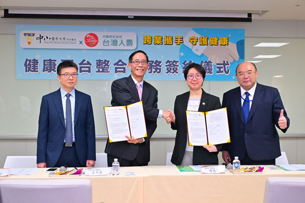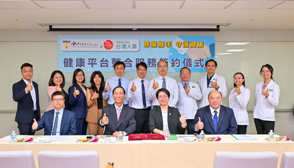 台灣人壽與中山附醫9日舉辦健康平臺整合服務簽約記者會,台灣人壽莊中慶總經理、葉栢宏策略長、中山附醫周英香董事長、蔡明哲總院長共同出席,並參訪中山附醫最先進「智慧賦能中心」。莊中慶總經理表示,醫療和保險都是安定社會的重要力量,台灣人壽有創新且豐富的保障型商品,在中臺灣亦有龐大的保險顧問團隊,長期深耕守護無數個家庭,未來結合中山附醫專業醫療資源及策略夥伴,透過「健康樂活管家」平臺提供「未病先防、已病能治、病後復原」的一站式守護,具體落實最有溫度的保險與醫療服務。