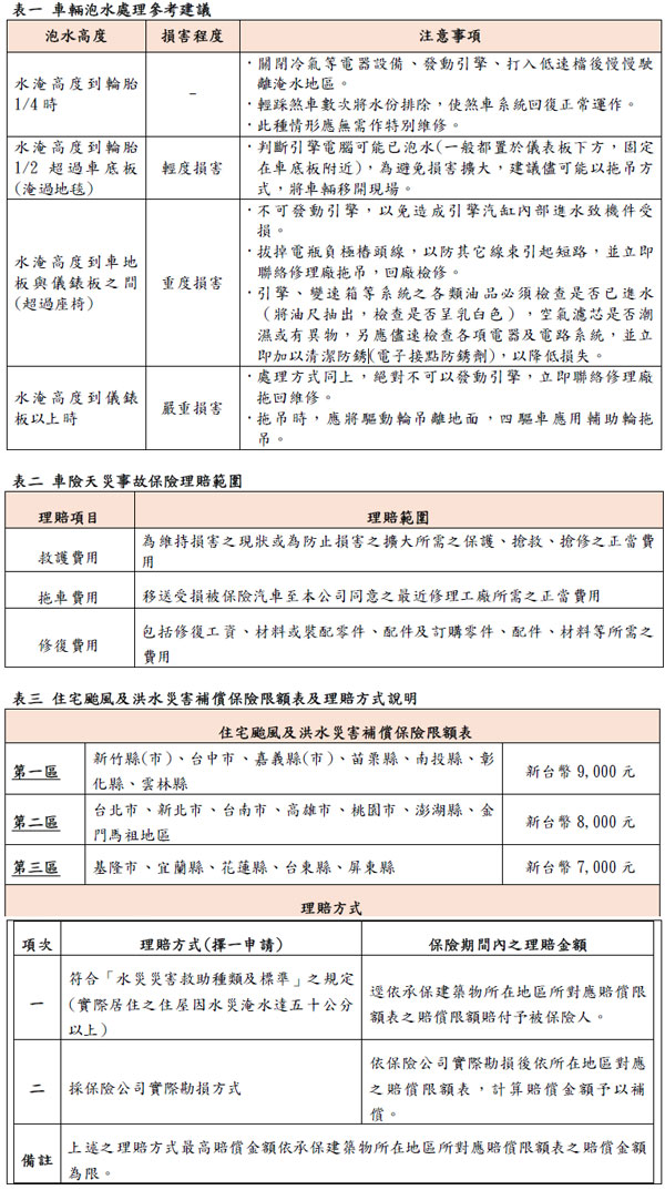 此外,若是住家發生淹水事故,則建議先針對住家周遭及屋內淹水情形拍照保全證據,並通知當地村里長,必要時會同警察派出所員警進行勘查,依據「水災災害救助種類及標準」規定,實際居住之房屋因水災淹水達50公分以上,即可申請政府淹水災害救助金。同時,因住宅火險已擴大承保「住宅颱風及洪水災害補償」之保險保障,若標的物發生颱風或洪水等事故,並符合「水災災害救助種類及標準」之規定,保險公司將依承保住宅所在地區不同,直接理賠7,000~9,000元不等之金額,若淹水未達50公分但有實際損失,則需要進行實際勘估並詳列損失清單,保險公司將依住宅所在地對應的賠償限額內,依實際損失金額賠付,民眾可依自身情況申請。