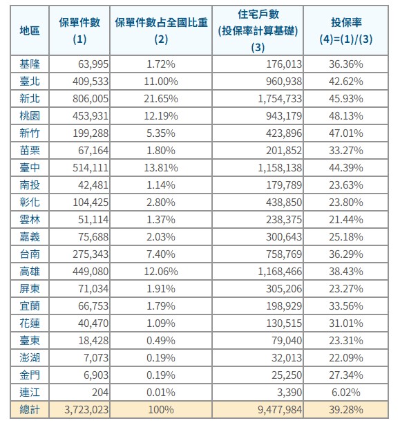 住宅基本保險截至114年8月31日全國平均投保率為39.28%(詳下表),花蓮縣投保率為31.01%。花蓮地區投保率較全國平均數低,分析基本原因是花蓮的偏鄉地區較廣,金融業較不發達再加上銀行貸款件偏低,而住宅基本保險投保率較高的主因是銀行貸款件,由於偏鄉房貸件較少,更需要民眾提高災防保險意識自發強化保障。住宅地震保險基金持續辦理各項宣導教育提升災防風險意識,除了針對一般民眾宣導、學校教育宣導,和保險從業人員教育訓練,未來的目標也將更進一步協助偏鄉銀行、農會、各地方災防單位和村里長一起推動,以減少偏鄉「保障缺口」。
