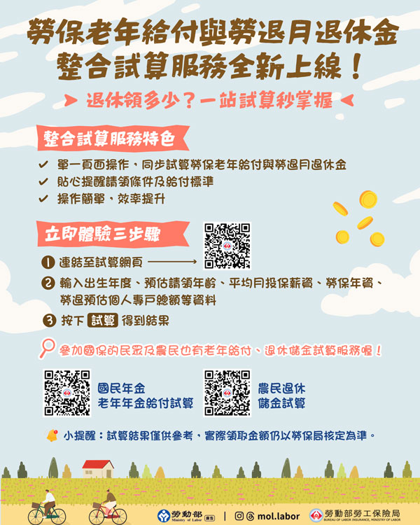 勞動部提醒,除了勞保、勞退的退休給付試算,勞保局也有提供「國民年金老年年金給付試算」(https://www.bli.gov.tw/0100754.html)以及「農民退休儲金試算」(https://www.bli.gov.tw/0105231.html)服務,無論是勞工、農民或參加國保的民眾,都可以透過勞保局提供的簡易試算服務,輕鬆試算老年退休給付,及早為未來的老年退休生活做好準備,歡迎民眾多加利用。