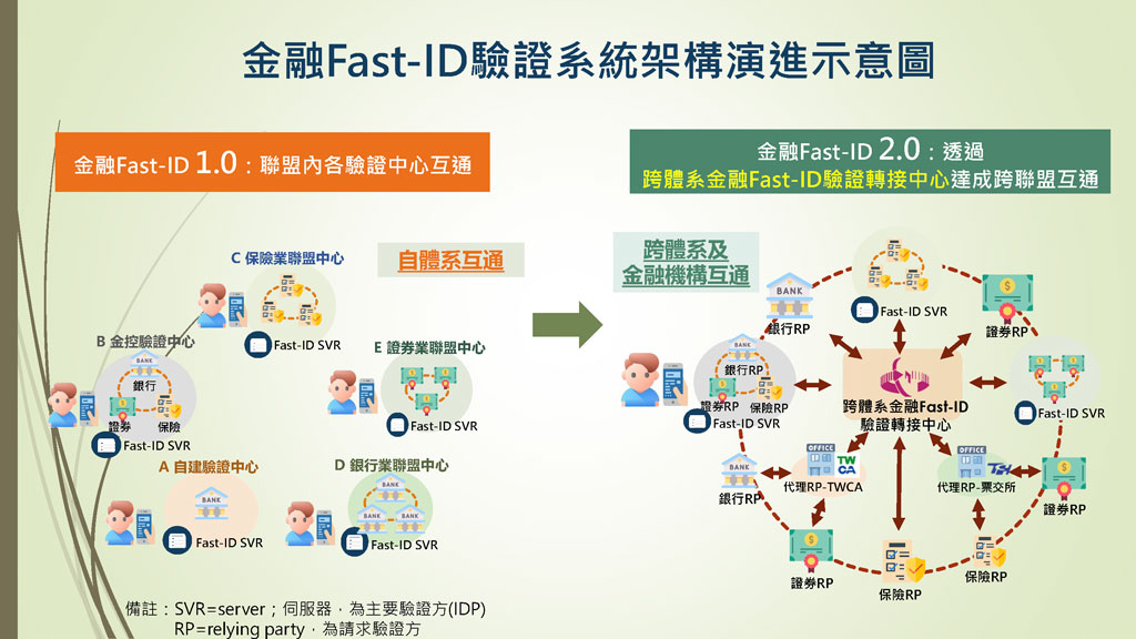 金管會自110年起推動「金融行動身分識別標準化(金融Fast-ID)機制」,第一階段促成同集團跨機構間的金融數位身分驗證。為進一步促進跨不同金融業別及機構間的互通及應用,金管會第二階段接續推動建置「金融Fast-ID驗證轉接中心」,民眾只要在任一家參加機構完成金融Fast-ID註冊,未來在其他參加機構線上申請金融服務時,即可透過驗轉中心進行身分驗證,並可在民眾本人同意下導入留存於原註冊機構的基本資料,讓民眾在數位金融的使用體驗更加流暢,並節省大量重複填寫資料的時間。