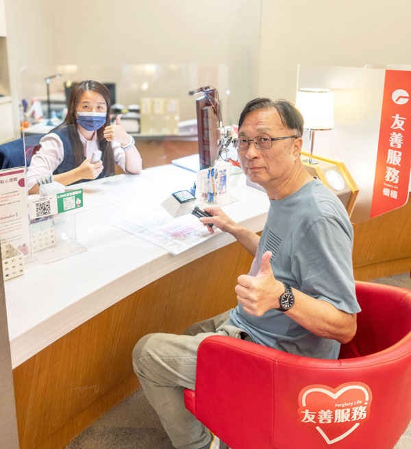 同時,為打造金融友善環境,建立可透過ID辨識65歲以上長者的專屬客服專線,並由客服專員線上提供放慢語速或提高聲量等友善服務,健全高齡保戶來電洽詢相關事宜;保戶服務部於台北總公司、台中及高雄分公司服務中心設置高齡友善服務櫃檯,提供放大鏡、拐杖夾、擴聽器及電動輪椅充電插座等多項輔助設施,並在進出口處設「服務鈴」,或指派人員導引與服務。