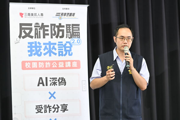 講座首先由刑事警察局偵查員魏培倫以多年辦案與犯罪預防經驗,透過「AI深偽詐騙」主題揭示近年詐騙新態勢。魏偵查員表示,AI技術普及化讓詐騙更加隱蔽且難以辨識,並舉例假檢警、冒親友借錢、合成不雅照恐嚇,甚至假冒公司高層成功詐走香港分公司逾8億元等真實案例,提醒學生落實「防詐5不」—不接、不點、不聽、不傳、不信,遇有疑慮務必撥打165反詐專線查證,以降低受害風險。