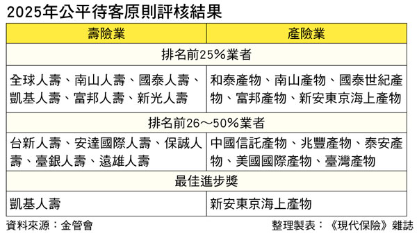 今(2025)年排名前25%的業者,壽險業為全球、南山、國泰、凱基、富邦及新光人壽,產險業為和泰、南山、國泰世紀、富邦及新安東京海上產物。其中,和泰產物繼去年獲頒最佳進步獎之後,今年首度躋進前段班,表現亮眼;而凱基人壽、新安東京海上產物則獲得「最佳進步獎」,3業者同時進入前25%榜單,展現出顯著成長。