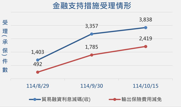 為協助廠商因應關稅政策影響,財政部推出「金融支持措施」,由輸出入銀行擔任執行單位,提供廠商「貿易融資利息減碼(收)」及「輸出保險費用減免」二項措施,並自8月7日開始受理申請。其中,「貿易融資利息減碼(收)」措施在輸出入銀行及28家公民營銀行共3,100營運據點積極推動下,受理成果顯著成長。