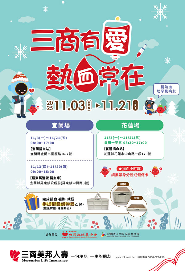 11月3日起,三商美邦人壽「三商有愛 熱血常在」冬季捐血活動正式開跑,本活動與台灣血液基金會的宜蘭及花蓮捐血站合作,為兩地的血液需求提供支持。為表達對每位捐血者的感謝,該企業特別準備「手提摺疊儲物籃」作為禮品,凡於11月3日至11月21日間,至指定捐血站捐出一袋血的民眾,皆可獲得。三商美邦人壽邀請民眾與家人和朋友們一同伸出援手,用熱血溫暖整個冬季,不畏寒冷!