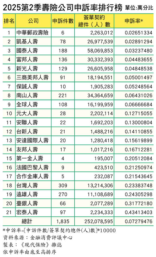 今年第2季壽險公司申訴率由低至高排行榜,前5名依序為中華郵政壽險、凱基人壽、國泰人壽、富邦人壽與新光人壽,5家申訴率皆低於萬分之0.05。其中,中華郵政壽險的申訴率從第1季的萬分之0.0578進步到萬分之0.0265;凱基人壽則從萬分之0.0357進步到萬分之0.0289。