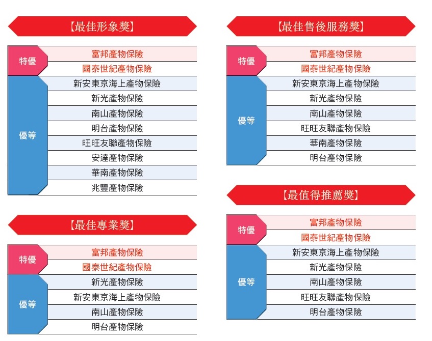 本屆「保險品質獎(產險組)」共頒發4大獎項,分別為【最佳形象獎】、【最佳售後服務獎】、【最佳專業獎】與【最值得推薦獎】,並依據受訪者勾選率結果,頒發「特優」與「優等」獎座。以下為第24回各獎項的獲獎名單: