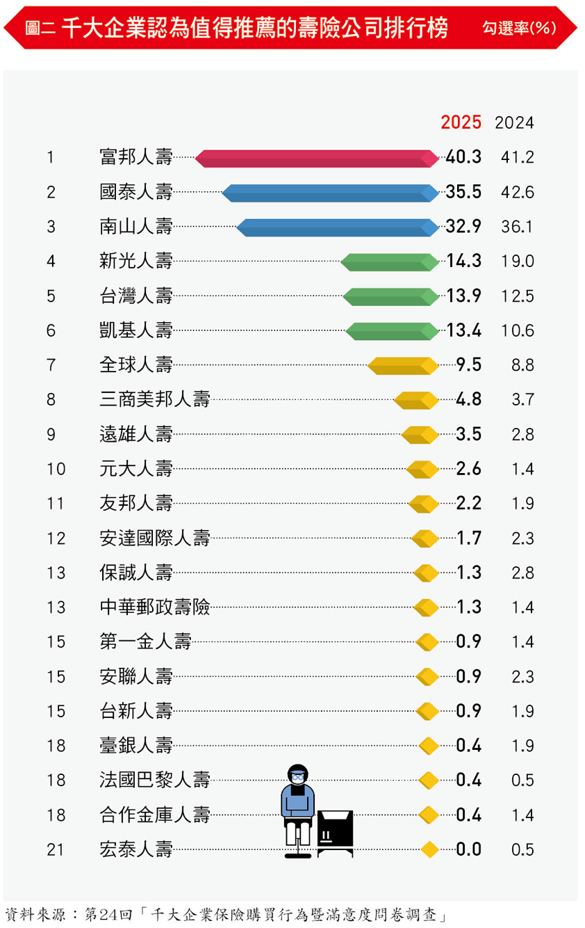 整體觀察,千大企業對壽險公司的推薦趨勢正逐步深化。富邦奪回龍頭、國泰暫居第二、南山強勢逼近,三強格局逐漸明朗;而企業對壽險公司的信任評價,也從單純的產品或服務滿意,轉向對「整合顧問力與長期支持力」的衡量。
