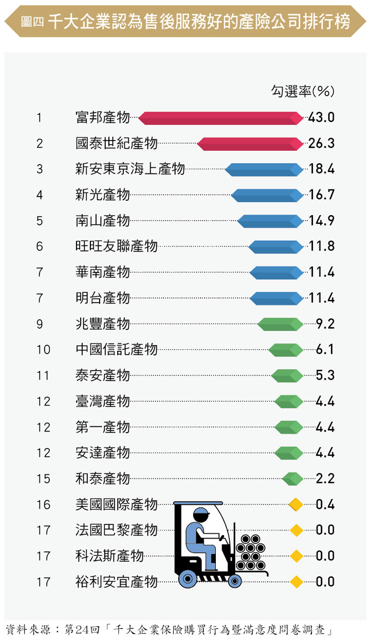 根據「第24回千大企業保險購買行為暨滿意度問卷調查」,哪些產險公司「售後服務」最受肯定?