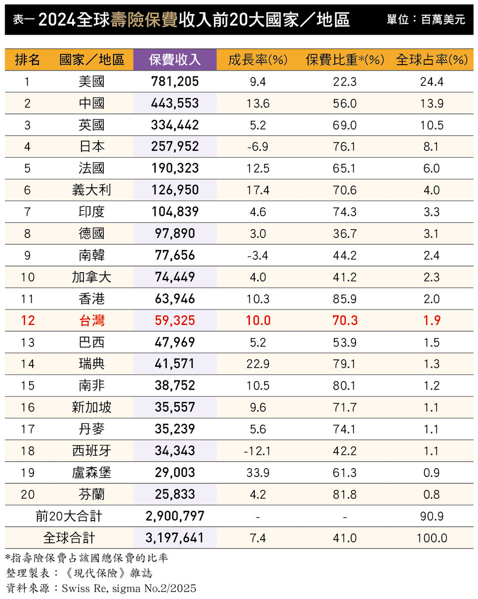 台灣壽險保費收入達593億美元,穩居全球第12名,年增幅達10%,成功扭轉前一年衰退12.9%的頹勢,展現強勁的復甦動能。