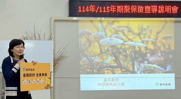 農糧署東區分署及宜蘭縣政府於14日舉辦「梨保險宣導說明會」,富邦產險偕同參與宣導梨保險商品及農民常見的詐騙樣態,以協助農民了解農業保險的重要性與理賠權益,同時加強農民防詐意識。