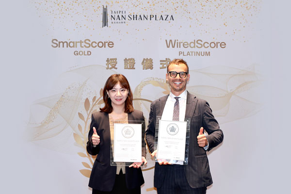 其中,臺北南山廣場以「永續智慧國際企業總部」為理念,積極導入國際認證體系中最高級別的標章,今日由Wired Score全球總部頒發SmartScore黃金級、WiredScore白金級建築雙認證,使其成為臺灣少數兼具智慧資通韌性、節能永續能力與健康環境的頂級商辦。