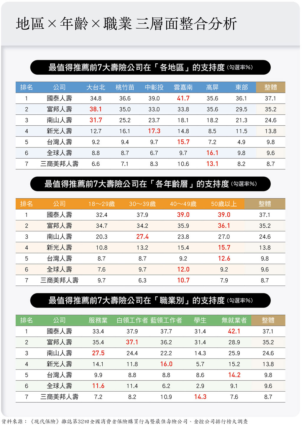 南山人壽則獲二四.六%推薦率,穩居第三。雖較去年略降,但南山在保戶數、理賠件數與通路經營上仍具深厚基礎,並在中高齡族群中維持高度信任,是典型的「穩健型口碑公司」。