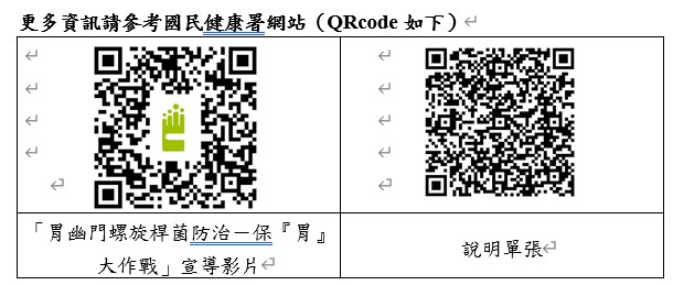 衛生福利部常務次長莊人祥表示,45至74歲符合資格民眾,請踴躍接受「糞便抗原檢測胃幽門螺旋桿菌」服務,如檢測結果為陽性,則依醫囑接受除菌治療等醫療處置;同時呼籲民眾落實「保胃五招」:保持均衡飲食、養成良好飲食習慣、規律運動、遠離菸、檳、酒與避免生食及不潔食物。衛生福利部提醒,若出現腸胃不適,請及早就醫,透過主動檢測與健康生活型態的結合,共同邁向健康好「胃」來。