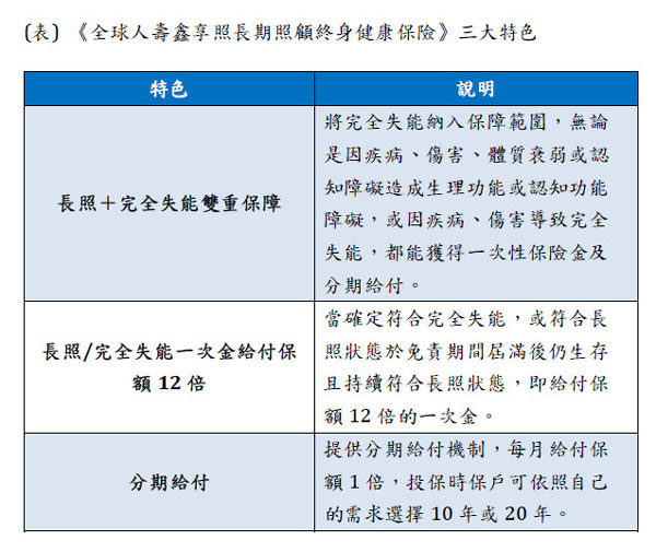台灣人口高齡化速度加快、失能人口攀升,長照需求孔急,不僅已是老年議題,年輕族群也可能因疾病或突發意外面臨照護需求。全球人壽為協助民眾及早規劃長照保障,推出《全球人壽鑫享照長期照顧終身健康保險》(以下簡稱《鑫享照》),以「長期照顧(或完全失能)一次給付+長期照顧(或完全失能)月給付」的雙重保障,不僅提供保戶在照護初期的費用填補,同時也提供保戶在照護期間穩定且不間斷的經濟支持,協助國人提前做好長照準備。