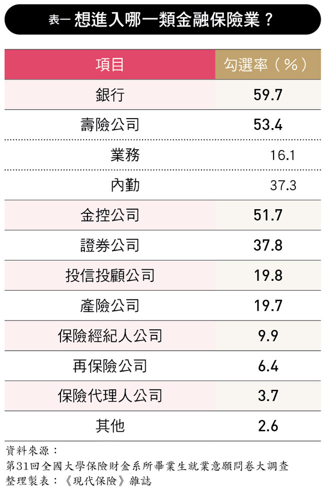 排第二的是壽險公司,勾選率五三.四%,高於上回調查的五二.一%,其中,內勤占三七.三%、外勤占十六.一%。這也反映出,儘管壽險業在職務型態與工作內容上較為多元,但整體而言,仍是科班生心目中具吸引力的金融保險業選項之一。