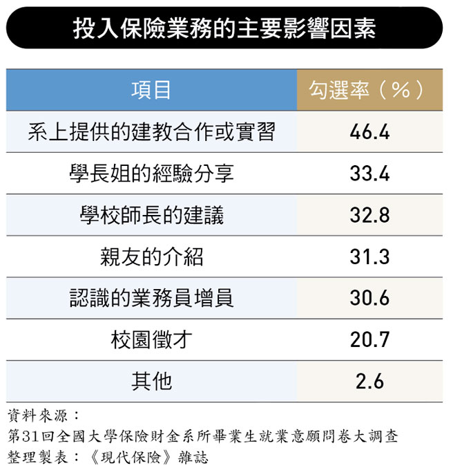 不過,進一步觀察影響學生是否願意投入保險業務的關鍵來源,可以發現,是否曾有實際接觸經驗,明顯左右其判斷。調查顯示,系上提供的建教合作或實習、學長姐的經驗分享,以及師長的建議,對學生的影響程度,普遍高於親友介紹或單向的增員邀請。這也意味著,多數科班生並非對業務工作本身抱持排斥,而是在缺乏實際理解之前,選擇保留觀望空間。 相對而言,僅透過校園徵才或短暫說明,較難讓學生形成完整判斷。業務工作的專業內涵、工作節奏與發展路徑,若無法在校園階段被具體呈現,容易停留在印象層次,而未進入實際比較。 整體來看,保險業務並非吸引力不足,而是高度仰賴接觸深度。對保險業而言,如何透過制度化實習、校園合作與前輩經驗分享,讓學生在畢業前即能理解業務工作的實際樣貌與長期可能性,將是影響未來業務人才來源的重要關鍵。 |