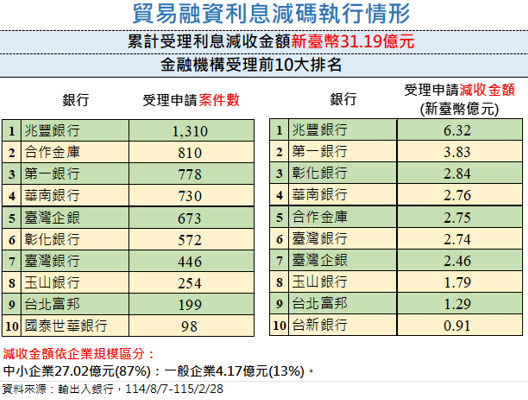 「貿易融資利息減碼(收)」措施除由輸出入銀行直接承辦外,並攜手28家承貸公民營銀行共同推動,透過約3,100個營運據點就近提供服務。凡具出口美國實績或其關連產業廠商,票、債信及營運正常,對美出口或營業額衰退達一定條件,均可申請。一般企業可享年利率減碼1%,每家最高減收新臺幣100萬元;中小企業減碼1.5%,最高減收120萬元。截至2月底止,受理申請件數及利息減收金額前十名之承貸金融機構排名如附表所示。該措施有效減輕企業利息負擔並穩定營運,亦有助金融機構提升客戶向心力,維護授信資產品質。