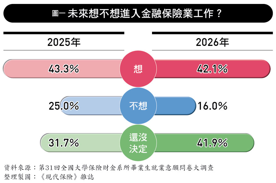 在整體就業市場競爭加劇、跨產業搶才日益明顯的背景下,金融保險業是否仍具備吸引年輕世代的條件,是近年產業高度關注的議題。從本刊執行的第31回「全國大學保險財金系所畢業生就業意願問卷大調查」來看,金融保險業在科班生的職涯考量中,仍是核心發展方向,但學生做出選擇的節奏,已出現明顯變化。