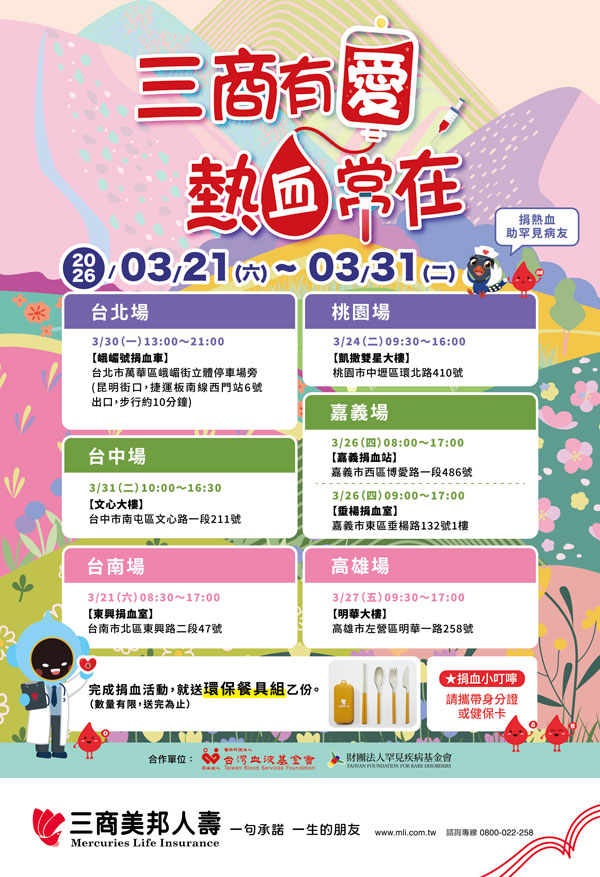 本次春季捐血活動將於3月21日自台南東興捐血室揭開序幕,後續場次依序為3月24日桃園凱撒雙星大樓、3月26日嘉義捐血站及嘉義垂楊捐血室、3月27日高雄明華大樓、3月30日台北峨嵋號捐血車,最終場為3月31日台中文心大樓,邀請大家把握時間,凡於捐血活動現場,每捐出一袋血(250cc),即可獲得該三商美邦人壽獨家限量的「環保餐具組」乙份。期望透過實用又具環保概念的贈品,傳遞永續公益與珍惜資源的理念。