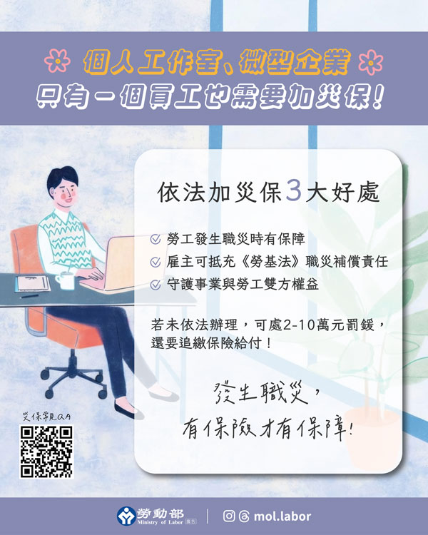 勞動部:微型企業、個人工作室注意! 只僱用1人也要納災保 員工安全有依靠