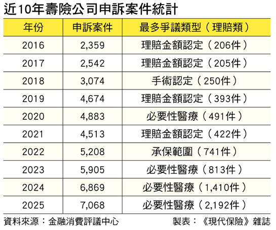 申訴件數增加的原因為何?從爭議類型觀察,近3年壽險理賠爭議皆以「必要性醫療」案件最多。2024年相關爭議為1,410件,2025年更突破2,000件,達2,192件,顯示隨著醫療科技進步與治療方式多元,部分疾病治療是否屬於「必要醫療」,可能成為保險理賠爭議的來源。
