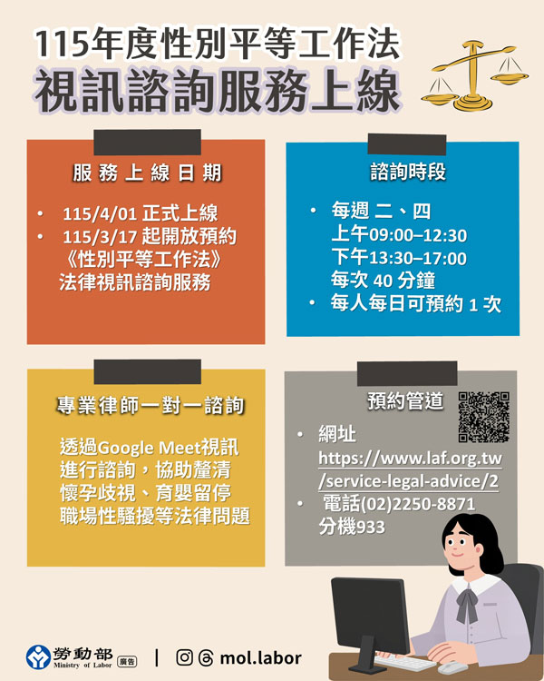 為強化性別平等工作權益保障,並提供勞工即時、專業且便利的法律諮詢服務,勞動部委託財團法人法律扶助基金會辦理「115年度性別平等工作法視訊諮詢服務」,設置法律諮詢管道,3月17日起開放預約,4月1日起正式上線,透過網路視訊方式,讓有遭懷孕歧視等性別歧視疑慮的勞工與專業律師一對一法律諮詢服務,讓勞工在專業隱私便利的環境下,釐清疑義,掌握自身權益。